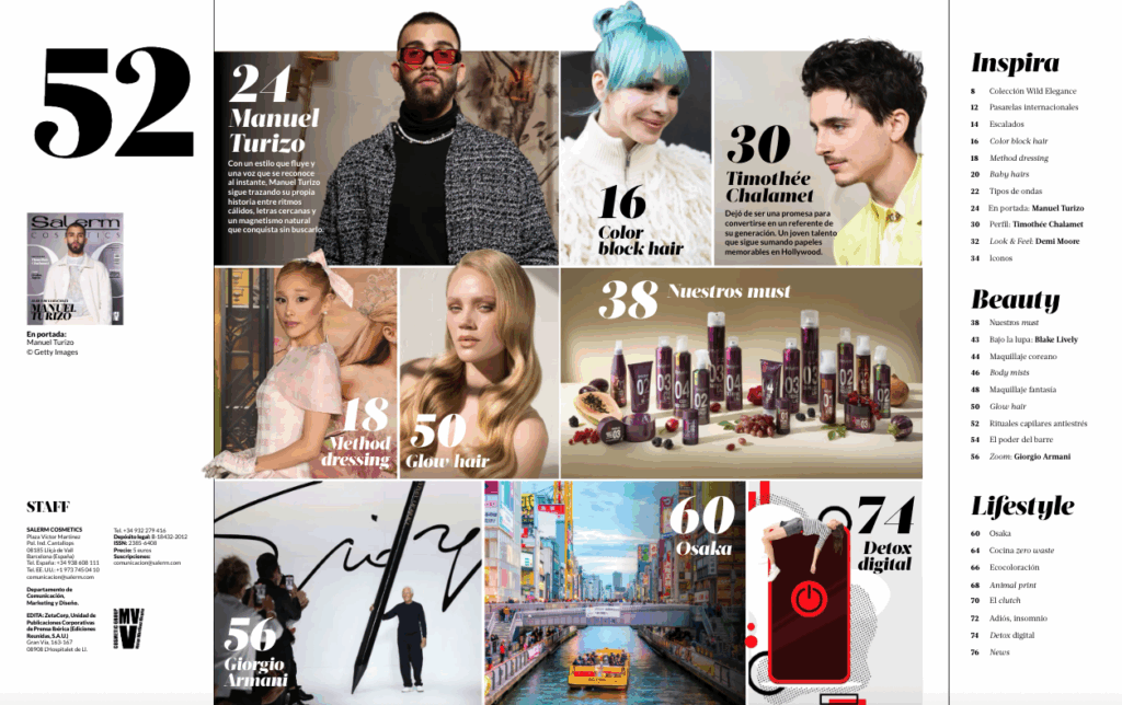Con una cuidada línea editorial, la revista ofrece contenidos que conectan tendencias, innovación, técnica y visión de negocio, reforzando el compromiso de Salerm Cosmetics con el desarrollo profesional del sector. Esta nueva edición reúne propuestas creativas, artículos especializados y novedades de producto, convirtiéndose en una herramienta clave para salones y estilistas.